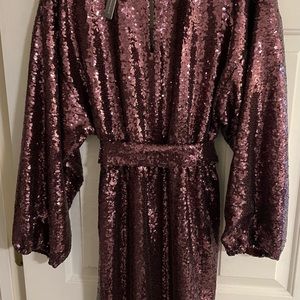 Purple sequined wrap style above the knee, long sleeve dress. Perfect for a cocktail party, wedding quest, concert, girls night out, bachelorette party, holiday party, formal events and more. Has a stretch and is very comfortable.