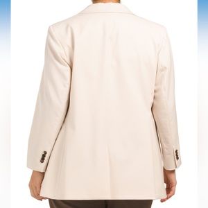 2 faux front pockets, decorative button cuffs, back vent, shoulder pads, fabric provides stretch