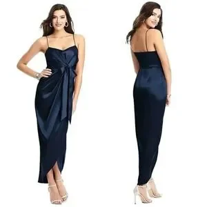 Nwt After Six Charmeuse Stretch Draped Midi Dress 10 Midnight Blue Satin Wrap
