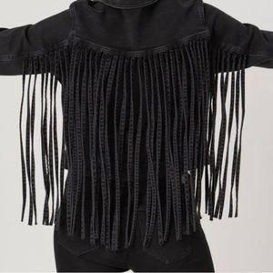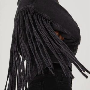 Fringe Black Smoke Denim Jacket has fringe back and crop body. Fits true to size made with 98% Cotton and 2% Elastane made in Turkey. Arm length 22 3/4” from pit to pit is 20” from back of neck to bottom of jacket is 21 1/2”