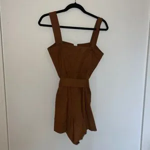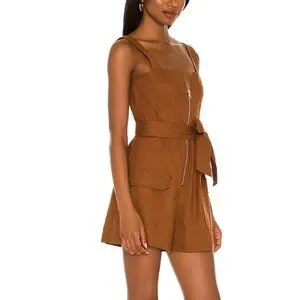 Wrap/Tie Romper perfect for fall, gamedays. Only worn once, recently dry cleaned 53% linen, 44% viscose, 3% elastane. Made in China. Dry clean only. Exposed front zipper closure. Front flap pockets. Detachable waist tie belt. Crisp linen fabric. Revolve Style No. LCDE-WR25. Manufacturer Style No. LARO39 U21.