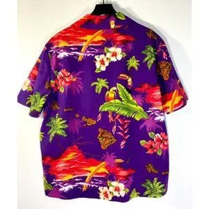 Men's Purple Hawaii Map, Floral And Bird Exotic Print On Button Down Short Sleeve Collared Polo Shirt.