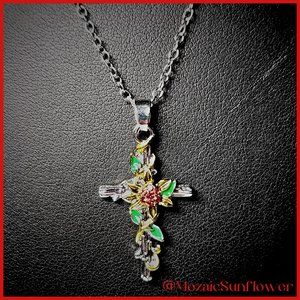 Beautiful Silver tone cross with Golden and Green Sunflower