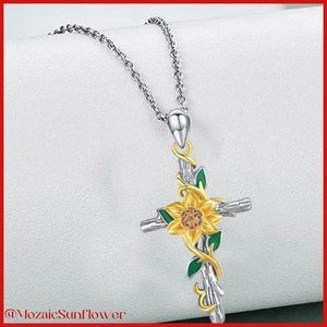 NEW Silver Cross With Sunflower & Amber Crystal Center Necklace