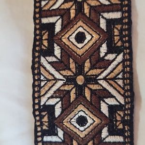 Very good clean condtion, no flaws found. This PU Vegan leather Purse/tote bag is really good quality, and you can tell it's made to last. The Razym embroidered strap reminds me of an embrodered guitar starp.