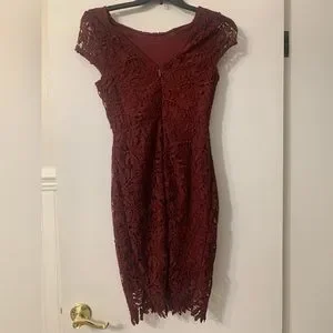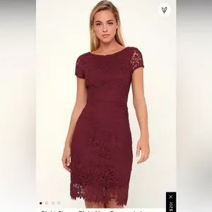 Beautiful quality crochet lace covers an under slip. High quality delicate overlay. I don’t see any imperfections in the lace. See closeups for detail. Wine burgundy color. Currently $88 on Lulus.com