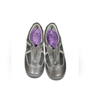 Great pre-owned condition. Minimal wear noted. This sporty leather / suede slip-on is designed with a front zipper for easy on / off and decorative side zip detail for a fun look. The feel is totally comfortable, thanks to a removable Soleassage™ insole that absorbs shock and massages while you walk. Moisture-wicking mesh sockliner helps keep feet cool and dry.