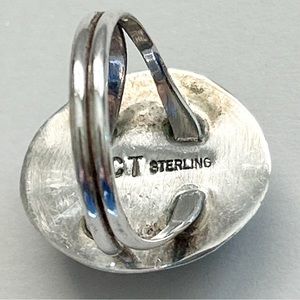 Vintage Clayton Tom Navajo Turquoise Sterling Silver Ring. Excellent vintage condition. Gorgeous blue turquoise in traditional design sawtooth setting. Turquoise is 12 x 16 mm, ring top is 20 x 24 mm. Signed CT and marked Sterling. Size 8.75 on mandrel. 5.8g
