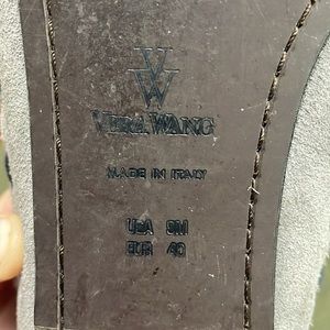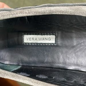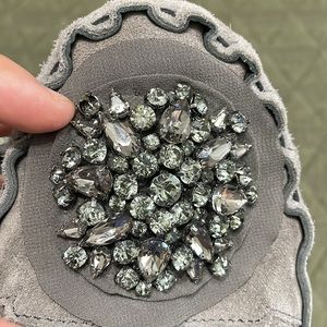 Vera Wang gray suede moccasin look flats with leather stitching and rhinestones embellishment.