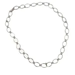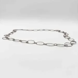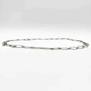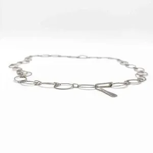 This Robert Lee Morris sterling silver necklace is linked together with small and large rings that look to be hammered silver. For every large link, there are two smaller ones. The hallmark is on the large hook clasp that enables one to easily shorten the drop length, with increases the length of the trailer chain down the back. At the end of this trailer there is a long thin silver pendant. It is a modern looking piece that can be worn in many different ways.