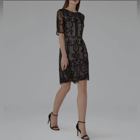 🌞REISS Zola Lace Dress Black Scalloped Hem V-Back Party Cocktail US 4
