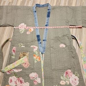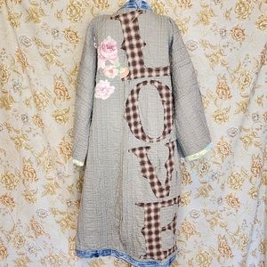 This OOAK piece of wearable art has been created from a vintage quilt into a kimono style jacket. Trimmed with deconstructed Levis denim waistbands and thoughtfully embellished with handmade appliqués made from all upcycled vintage materials.