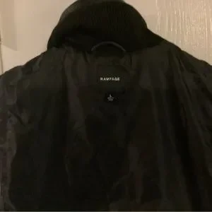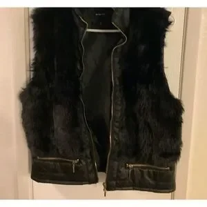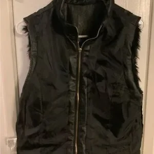Very cute Rampage faux fur black vest, size large, (I would say a petite large or medium, I was never able to wear it because I’m broader shouldered) It is used but brand new as it has never been worn. Cute vest, very versatile, dress it with jeans or with a skirt. No wear, tears, smells. The photos show vest zippered, and inside out to view inside. Thank you for peeking.