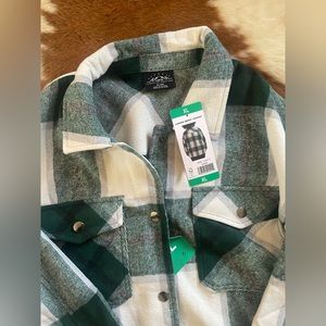 New with tags! XL Women’s fit, green and white plaid with nice pockets! Button snap enclosure, soft and cozy. Just too big for me.
