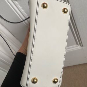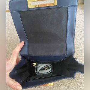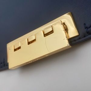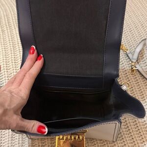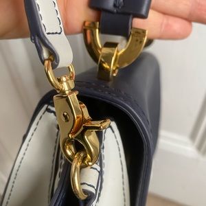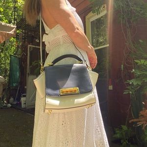 A chic and structured mini top-handle bag in a striking navy-and-white colorblock design. Crafted with Zac Posen’s signature architectural lines and finished with the iconic gold-tone hinge lock.