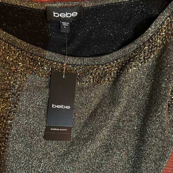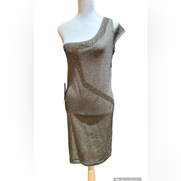 NWT bebe one shoulder metallic gold color cocktail dress boutique dress with sequins detailing size Large In excellent new condition no stains or flaws