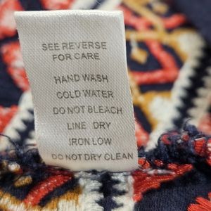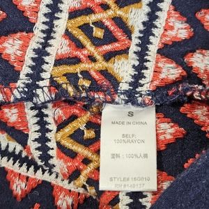 Deep navy blue with vivid red, orange, and white embroidered waistline. Tieable V-neck with metal bead accents. Great condition, mild pulls may be present. Please see photos for more details.