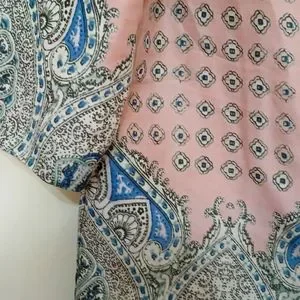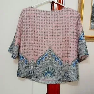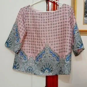 Vintage 80s Ann Taylor Top; lightweight; Pink with blue flower patterns and black outlining; Top has a Pink lining made of 100% Polyester; Size S approx 18" pit to pit, 21"L; used vintage, excellent condition.