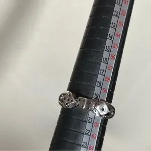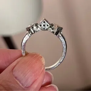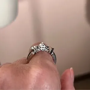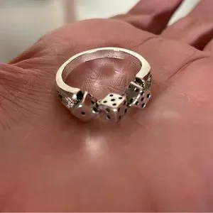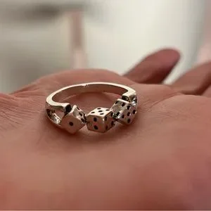 get ready to play with this charming dice ring. Made from a silver tone metal with blacken dots on the dice. unisex