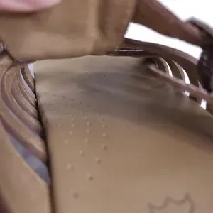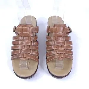 Brown strappy leather clog summer sandals. Adjustable strap. Easy slip on with open toe.
