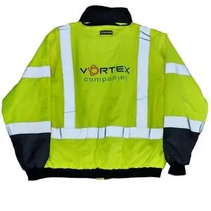 A company name (Vortex Companies) is on the back. I felt that it didn't matter for someone having to get outside for work or conditions that you need high visibility. I thought that it would fit my son in case of a break down in his truck but he needs 2XL. A small blue ink stain is on the bottom of front pocket. A few of small black stains are on the sleeve. Otherwise, it's in excellent condition. I'm in the process of trying to remove the stains and will take pictures of the remaining ones when done.