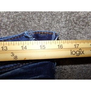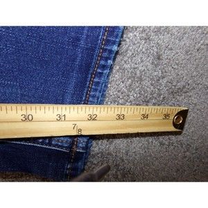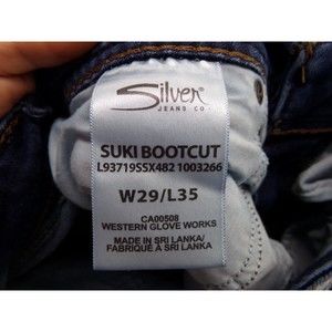 These SILVER Suki bootcut jeans are a stylish addition to any wardrobe. The dark wash and solid pattern make them versatile for any season, while the zip and button closure provide a secure fit. Made from a cotton blend denim fabric, these jeans have a mid-rise and regular fit with a 32.5 inch inseam. The jeans come in a women's size W29 L35 and have a waist size of 32 inches. The bootcut style and Silver Jeans Suki model add to the overall look. These jeans are perfect for any casual occasion or can be dressed up for a night out.