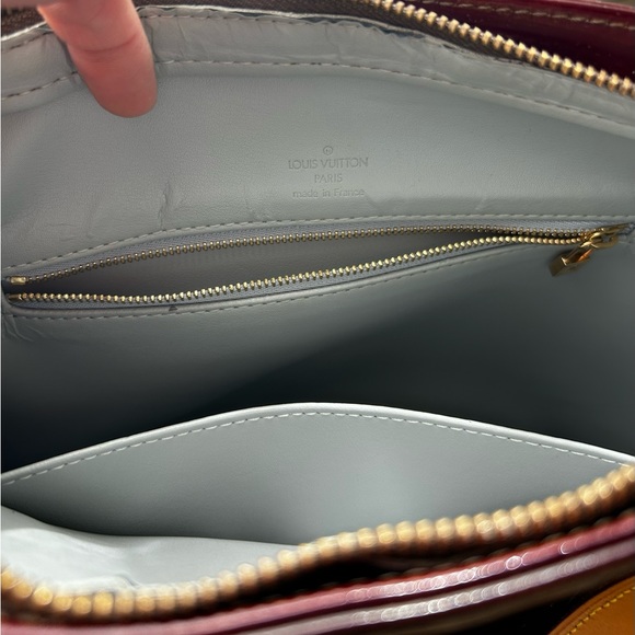Interior and exterior zippers have LV pulls and slide easily both ways.