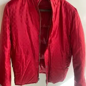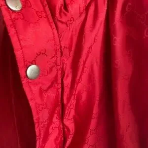 Reversible Gucci puffer coat in red nylon with red/green signature web epaulettes and GG monogram on reversed side.