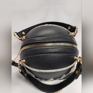 Black basketball purse with both a hand and shoulder strap and rhinestones on the basketball name and stripes. 6.5" round