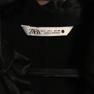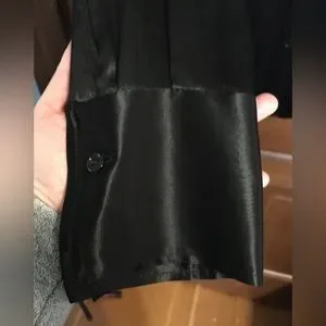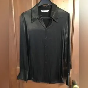 Black long sleeved button down shirt. Satin like material - on trend right now. Classic timeless style.