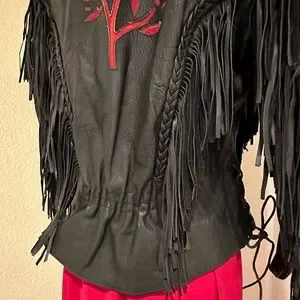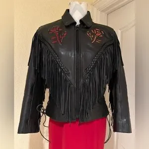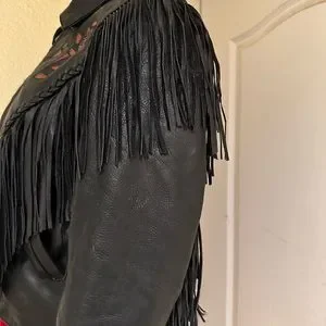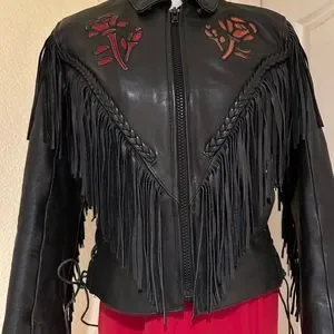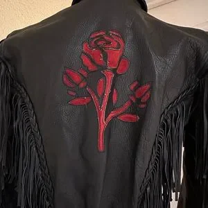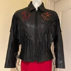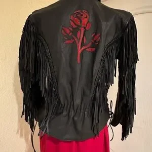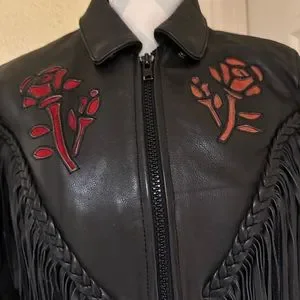 Black Fringe Leather Biker Jacket with Cut Out Rose Details