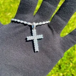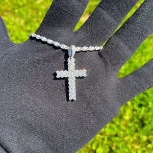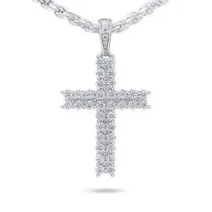 2 Row VVS1 Moissanite Cross Pendant Men Women, 18k White Gold Plated 925 Silver