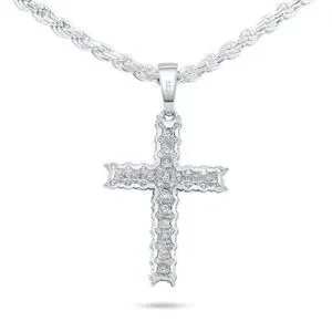 2 Row VVS1 Moissanite Cross Pendant for Men Women, 18k White Gold Plated Solid 925 Silver + Italian Silver Rope Chain, Pass Diamond Test!