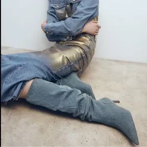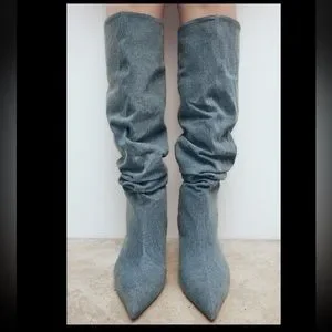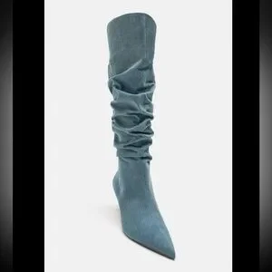 NWT. Never worn. Brand new condition. Heeled boots in denim fabric. Slouchy shaft. Pointed toe.