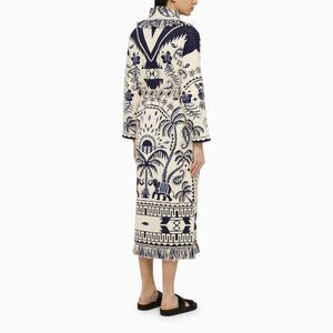 Blue and white cotton and wool knit long cardigan with a belted waist by Alanui, decorative fringes on the edges and two welt pockets on the sides. Model wears size S Model measurements: Height: 179 cm Chest: 82 cm Waist: 65 cm Hips: 90 cm