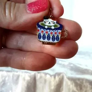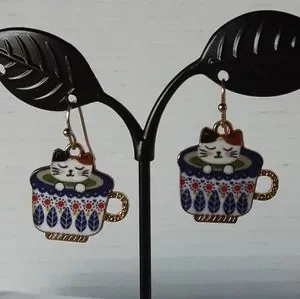 Handcrafted Cat In Tea Cup Pierced Dangle Earrings Blue