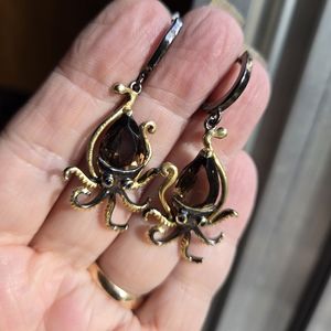 These are a NEW pair of SUPER CUTE Octopus ๐ Earrings for my Natural Edge Kharma Collection 2024. These fun earrings are made with solid 925 sterling silver covered in Rhodium and 24k gold accents. The large stones are 8k smokey quartz and the Octopus has sapphire eyes ๐. These are a little over 1-2" and are lightweight. Please ask questions and make an offer. I can't say yes if you don't ask!