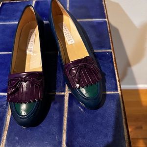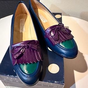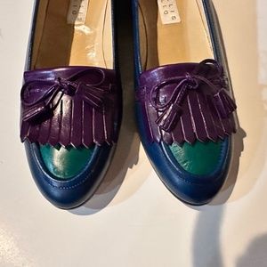 Beautiful Tassel Loafers in Blue Multi Color Colorway / Color Block Design. Royal Blue, Purple and Green Leather. Size 7.5 B. New in Box never worn, perfect condition. Size 7.5 B Runs true to size. Just gorgeous. Very well made! Beautiful colors but rather hard to photograph. Vintage 80s NOS (New Old Stock) . c 1985