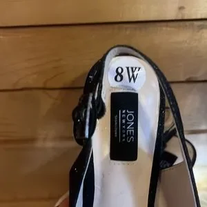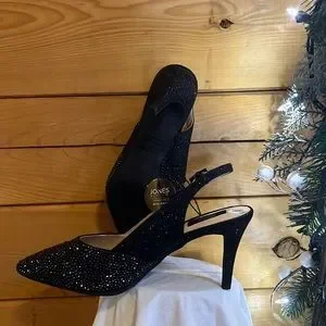 Black with black rhinestones. Adjustable slingback. Tiny portion where rhinestones came off- in last photo- not not able when worn (I only noticed when inspecting for listing). 8 wide, but I think will also fit a regular 8.