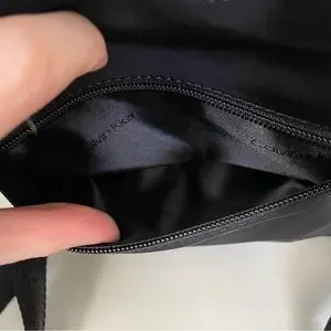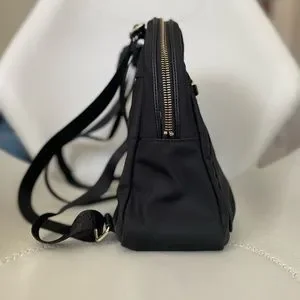 Lightly used, 2 exterior slip pockets & 1 Exterior zip pocket, 2 interior slip pockets & 1 Interior zip pocket, adjustable straps. Little to no wear on handles. White spot on front, collects dust easily, 2 pin holes on front.