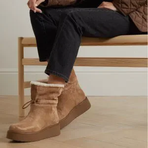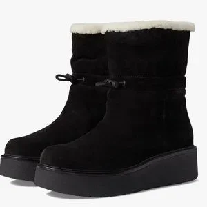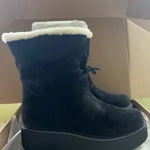New with tags!! Shearling lined, suede boots. Water resistant & platform rubber sole. Stylish, warmth and comfort! The Vince® Bellingham boot is a pull-on 1 1⁄2 in platform boot made of black suede outer with dyed lamb fur shearling lining and a bungee cinch closure. Heel Height: 2 in, Weight: 1 lb 10 oz, Shaft: 8 in. Never worn, still in original packaging with includes box and shoe bags. Purchased directly from VINCE. **Model is wearing the tan version in photo but only black is for sale.