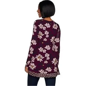 Achieve a perfectly put-together layered look with the combination of this printed knit top and solid knit tank. From LOGO by Lori Goldstein(R). Includes top and tank Top Fabrication: knit Top Features: scoop neck, allover print, long sleeves, two side-seam pockets Top Fit: semi-fitted through the bust and waist, follows the lines of the body with added wearing ease; flares to a full bottom opening Top Length: missy length 26" to 28-1/8"; plus length 28-1/2" to 30-1/4" Top Content: 95% rayon/5% spandex Top Care: machine wash, dry flat Tank Fabrication: knit Tank Features: contrasting color, tacked to inside shoulder seams of top, visible at bottom hem Tank Fit: semi-fitted through the bust and waist, follows the lines of the body with added wearing ease; flares to a full bottom opening Tank Length: missy length 29-1/2" to 31-5/8"; plus length 32" to 33-3/4" Tank Content: 95% rayon/5% spandex Tank Care: machine wash, dry flat Imported
