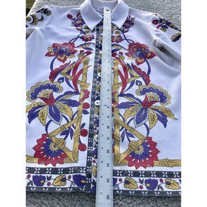 Wonderful vintage Smartique brand USA polyester button down shirt white w purple and red accents floral and bamboo pattern w pearlized style buttons pointed collar. Vintage sizing women’s 36 M L please see measurements I saw a snag in material yet cannot find it again. No stains holes or rips has vintage button collar loop