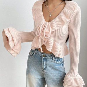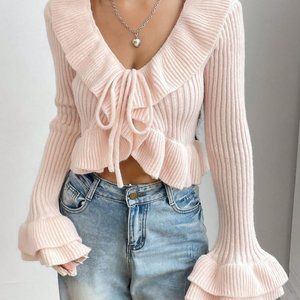 Apricot Casual Womens Ruffle Trim Knot Front Flare Sleeve Crop Cardigan