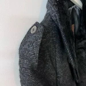 Classy warm coat. Black/dark grey melange color. With velvet collar and lapel. Belted with military details. Good condition. The tag says size L but in reality it fits as a M
