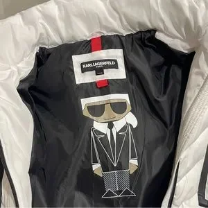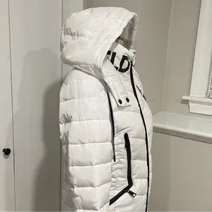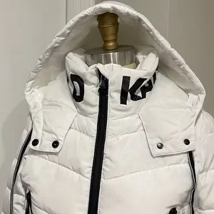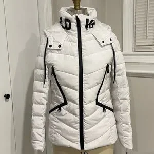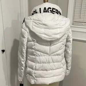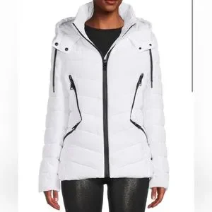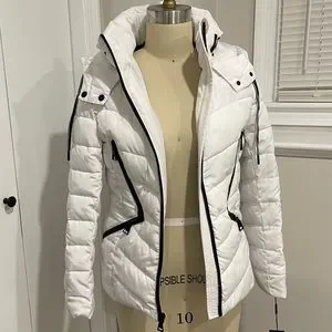 Warm, insulated puffer jacket with a hood and quilted finish.