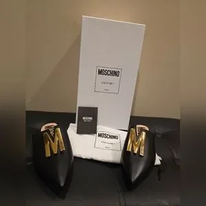 🔥🔥🔥Moschino Black Leather Logo Pointy Mules Sandals