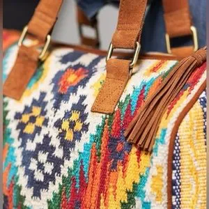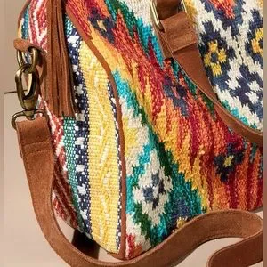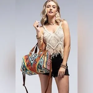 If you love Ariat and Pendleton bags you'll love this Ruggine woven satchel. This southwest inspired boho bag is made with genuine leather handles in a vibrant aztec pattern and works well as a daily handbag or overnight bag. Perfect for road trips!