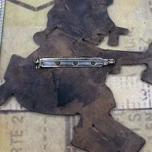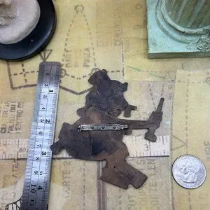 Huge vintage brooch pin that is not signed. Smoke free. Brass tone with great detail. See all pics for size and detail. Brooch has a working pin mechanism as shown. Show wear and patina with age. Tribal, boho, art, artist, wearable art, original, jewelry, art fair, studio, brooch, pin, mod, modernist, abstract, handwrought, hand wrought, hand made, metal work. Shown with ruler and coin to show size. Ruler and coin not included. Shows wear and age. Sold as is. Vintage estate costume jewelry.
