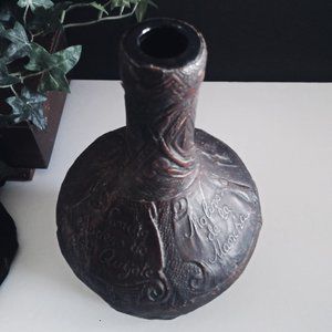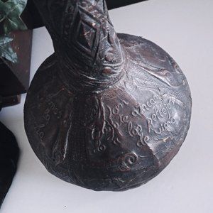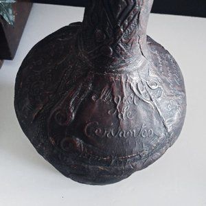 This handsome bottle is encased in embossed leather that is themed for the spanish epic novel Don Quixote, Sancho. The book was originally published in 1605.